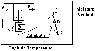The contact factor of a humidifier is defined as the efficiency for humidification. A 100% efficient humidifier will bring the moisture content of the air to the saturation moisture content at the apparatus dew-point, mcC. The contact factor of the humidifier can be defined by the moisture content differences: