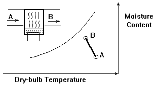 A pan steam humidifier uses a heating element inside a water tank. The tank is mounted at the bottom of the air duct. The air flowing over the water surface will cause some evaporative cooling which results in drop of air dry-bulb temperature. The ratio of sensible heat to total heat is approximately 0.2